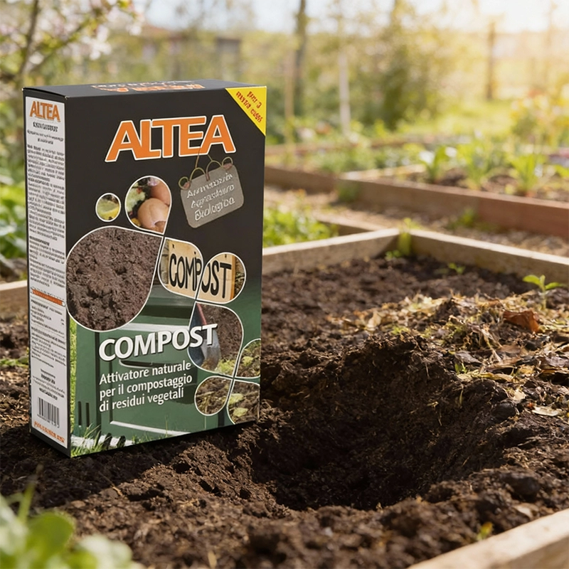 Altea Compost je naravni aktivator za kompostiranje, ki pospeši razgradnjo rastlinskih odpadkov in bogati kompost z dušikom in fosforjem za izboljšano kakovost tal.