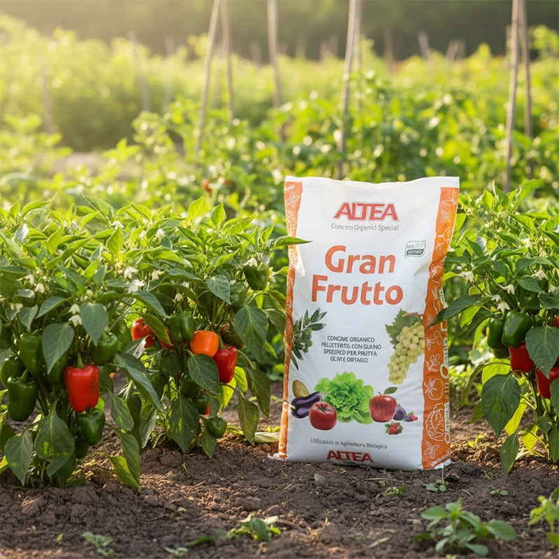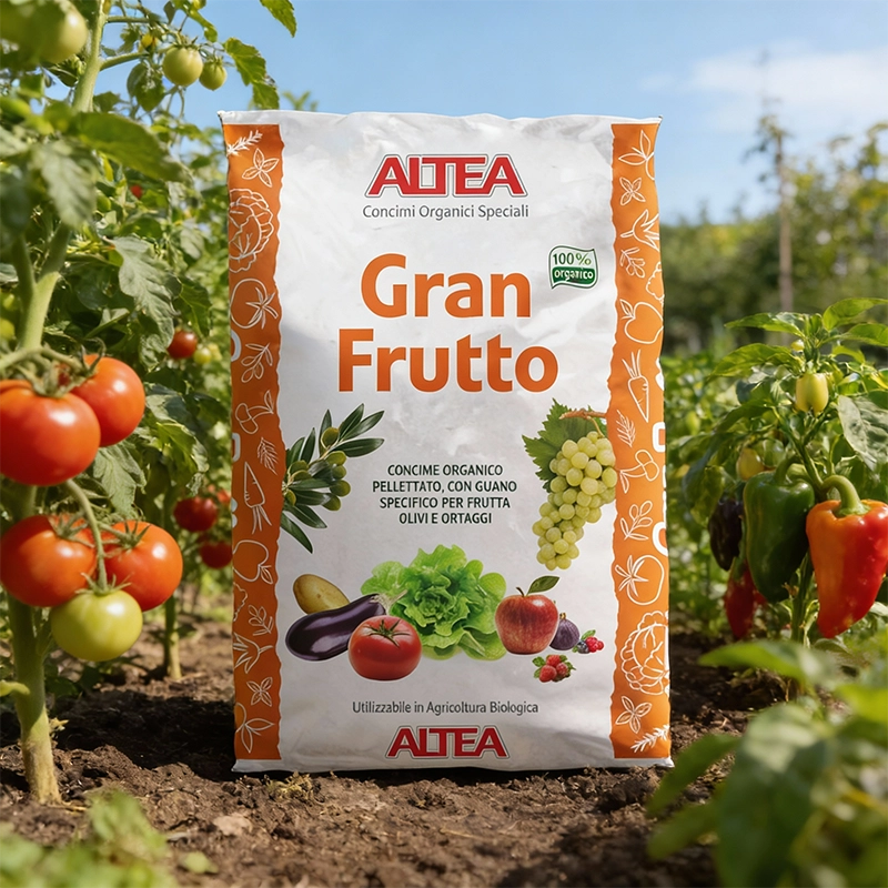 Altea Gran Frutto je peletirano organsko gnojilo za ekološko pridelavo sadja, oljk in vrtnin. S počasnim sproščanjem zagotavlja rastlinam dolgotrajno hranilno podporo.