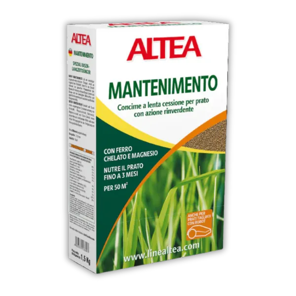 Altea Mantenimento je profesionalno gnojilo za vzdrževanje trate, ki vsebuje železo in magnezij za hitro in enakomerno ozelenitev vseh vrst travnatih površin. S formulo počasnega sproščanja hranil omogoča do 3 mesece trajno oskrbo trate z dušikom in drugimi pomembnimi elementi. Primerno za uporabo v vseh letnih časih, to gnojilo zmanjšuje potrebo po dodatnih sredstvih za nego in prispeva k stabilnemu vzdrževanju trate. Altea Mantenimento je enostavna rešitev za dolgotrajno nego travnate površine.