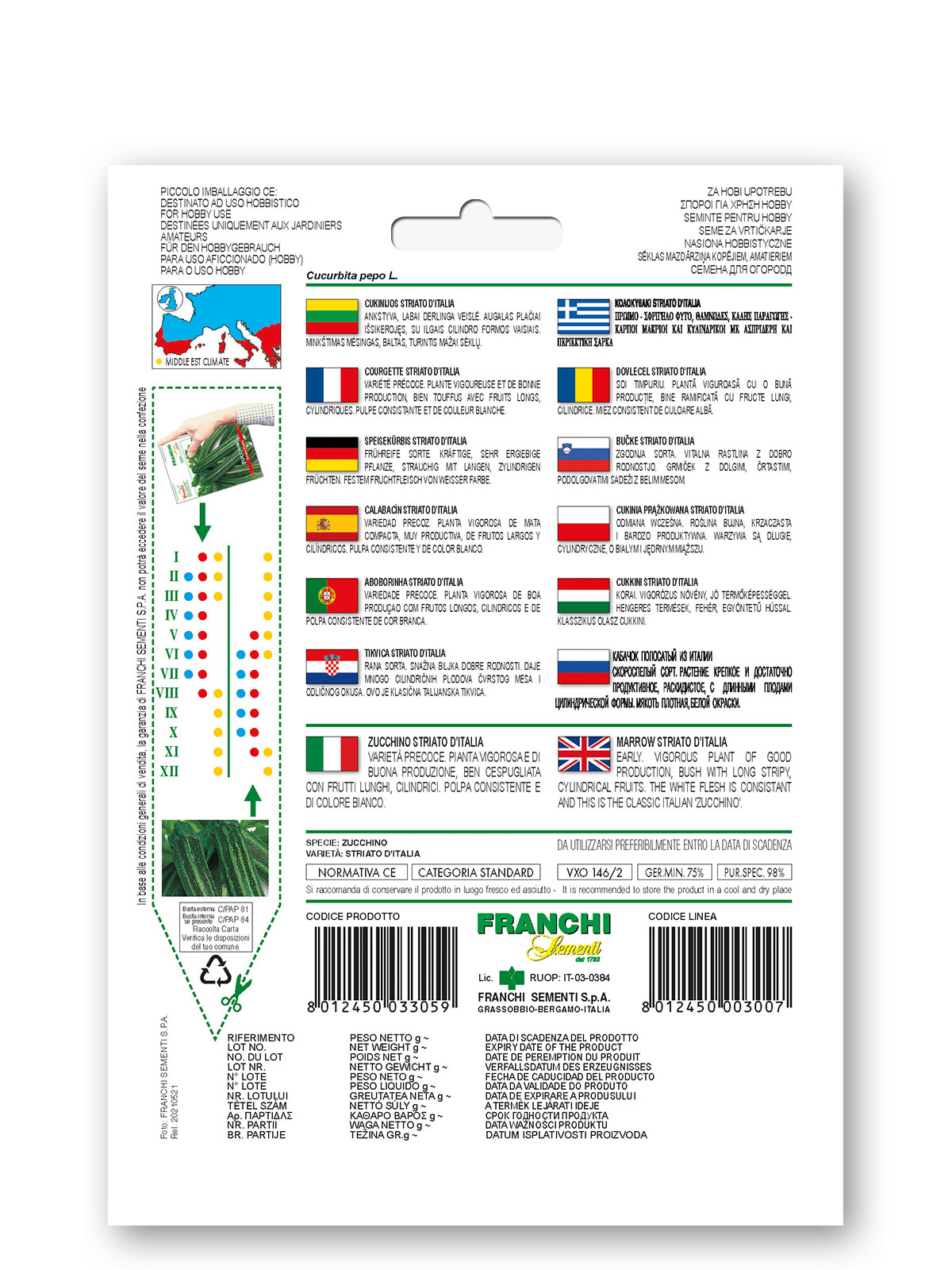 Črne bučke DI MILANO so srednje zgodnja sorta, ki obrodi podolgovate plodove temno zelene barve. Vsebina je čvrsta in bela.