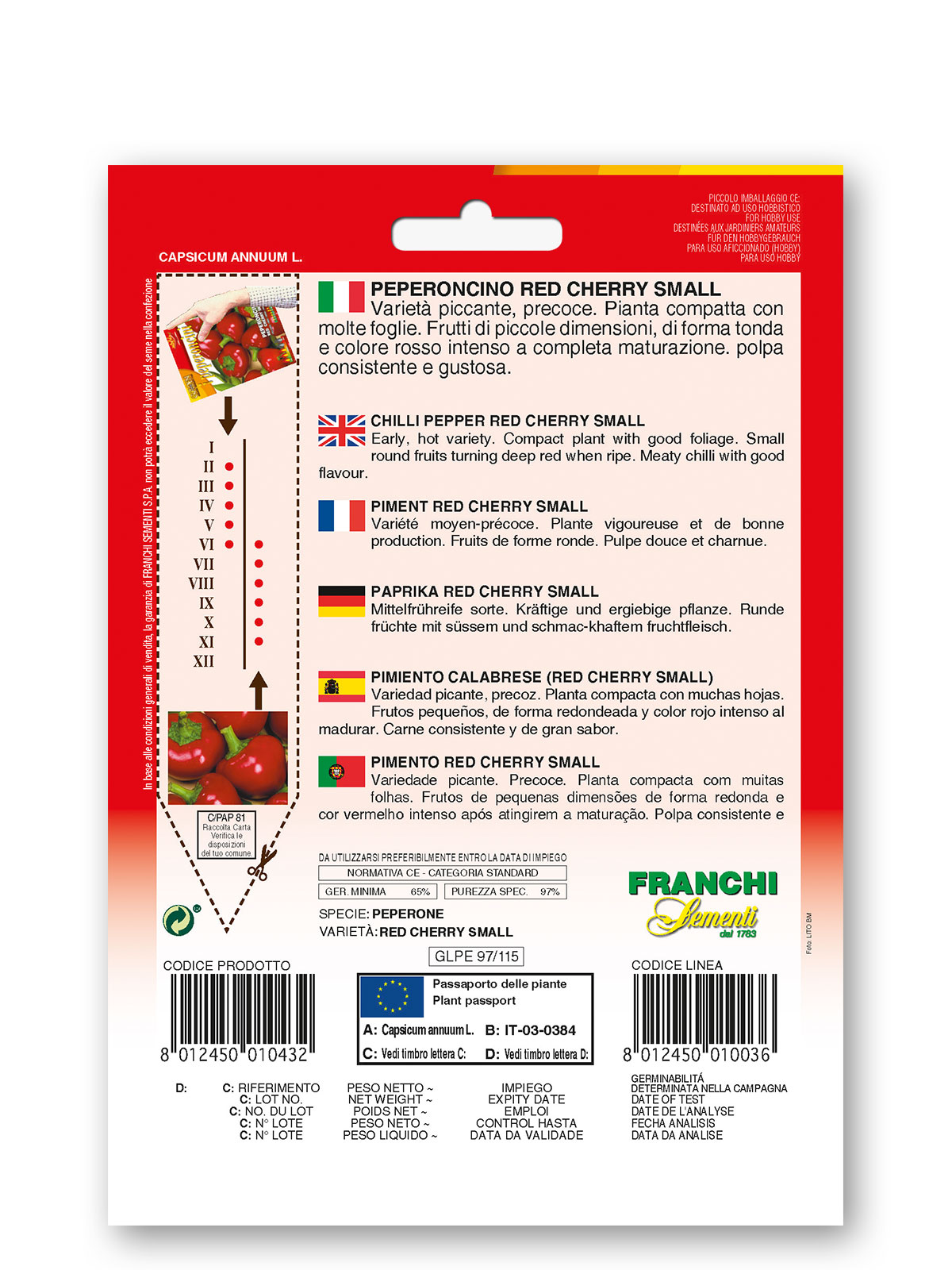 Red Cherry Small (CAPSICUM ANNUUM L.) je zgodnja in kompaktna sorta čilija z bujnim listjem. Razvije številne majhne, okrogle plodove, ki ob polni zrelosti dosežejo intenzivno rdečo barvo. Plodovi imajo čvrsto, mesnato meso ter prijetno pikanten in aromatičen okus.
