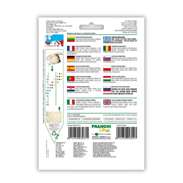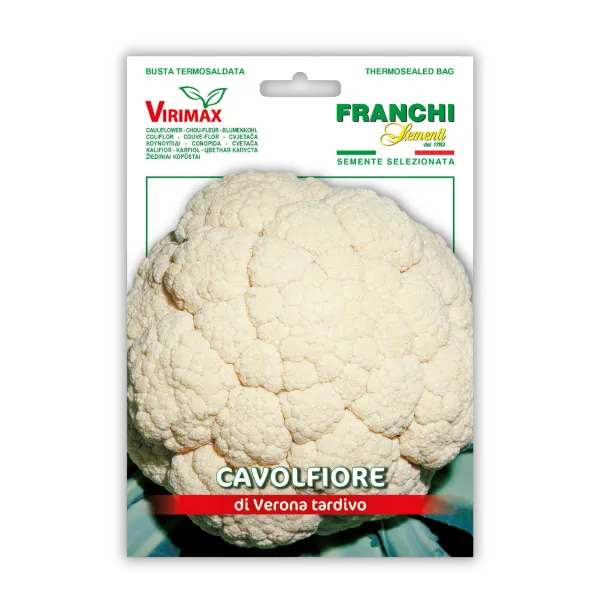 Cvetača Verona Tardivo je pozna sorta z bujno rastjo in srednje visoko rastlino. Listi so rahlo oviti okoli čvrstega cveta, ki je okrogle oblike in bele do ivornate barve. Cvetača je bogata z vitamini, kot so vitamin C, K in folati, ter se uporablja v številnih jedeh, kot so solate, pečene jedi, pireji in juhe. Pridelava je mogoča od aprila do julija, saj sorta dobro uspeva v poletnih mesecih. Kalivost semen je 70%, čistoča semen 97%. Proizvajalec: Franchi Sementi. Pakiranje: 2g.