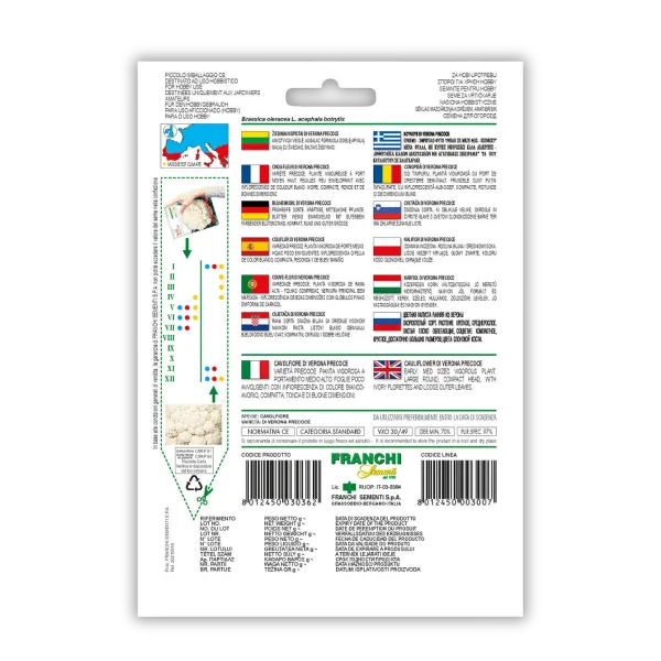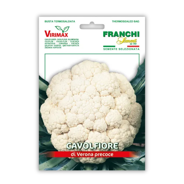 Zgodnja veronska cvetača tvori velike, okrogle in čvrste glave s slonokoščenimi cvetovi ter ima ohlapne zunanje liste. Pakiranje: 2g.