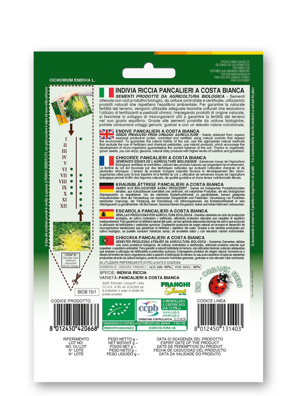Endivija Cuor d’Oro je zgodnja sorta kodrolistne endivije, ki oblikuje glavo s polno sredico, nazobčanimi listi in belimi peclji. Pakiranje: 10g.