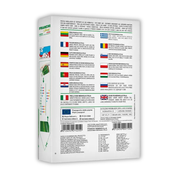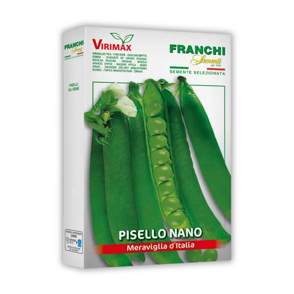 Semena graha Pisello Mezza Rama Rondo, srednje zgodnja sorta, ki doseže višino 70 cm. Rastlina ima dolge zelene stroke s 8-10 nagubanimi zrni, primerna za zamrzovanje.