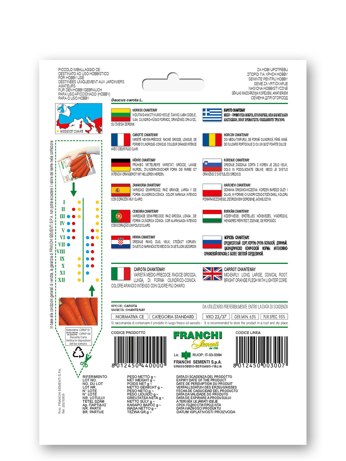 KORENJE NANTES semena na traku za enostavno setev. Srednje zgodnja sorta. Koren je valjaste oblike, srednje dolžine in rdeče-oranžne barve z majhnim jedrom. Meso je nežno in hrustljavo.