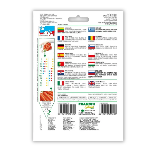 KORENJE NANTES semena na traku za enostavno setev. Srednje zgodnja sorta. Koren je valjaste oblike, srednje dolžine in rdeče-oranžne barve z majhnim jedrom. Meso je nežno in hrustljavo.