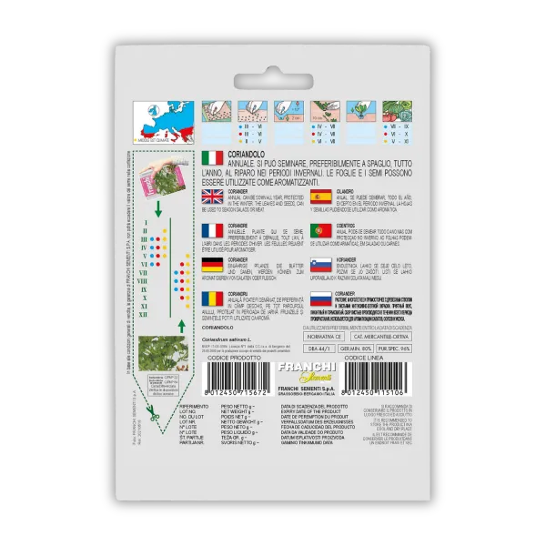 Koriander je enoletnica, ki se lahko seje skozi vse leto. Njeni listi in semena se uporabljajo kot aromatična dodatek k solatam in mesnim jedem.