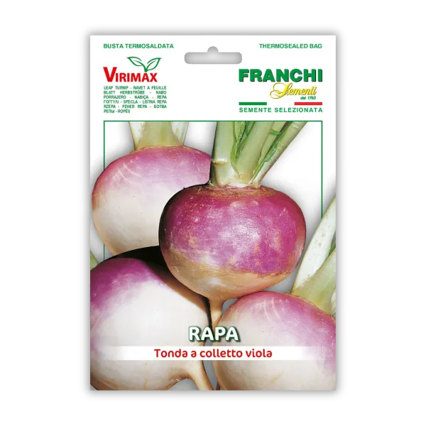 Kranjska okrogla repa Tondo a colletto viola (Brassica rapa L.) je srednje zgodnja sorta z dobro razvitim listjem in okroglim korenom, ki ima vijolično obarvan vrat. Koren je velik, z belo in čvrsto sredico. Rastlina je primerna za gojenje od aprila do avgusta in je odlična za uporabo v različnih jedeh. Kalivost semen znaša 80 %, čistoča semen pa 97 %. Proizvajalec: Franchi Sementi. Pakiranje: 12g.