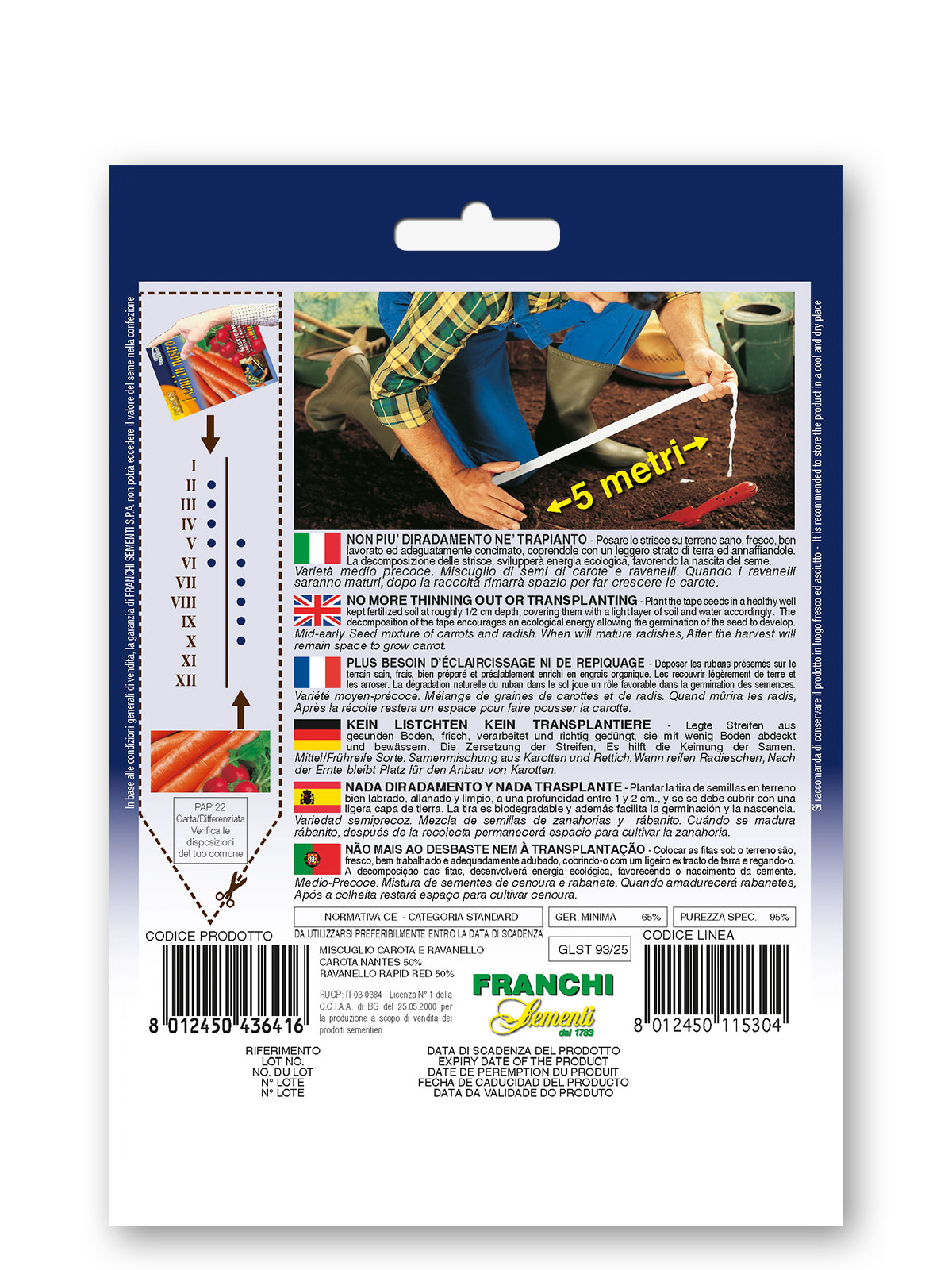 KORENJE NANTES semena na traku za enostavno setev. Srednje zgodnja sorta. Koren je valjaste oblike, srednje dolžine in rdeče-oranžne barve z majhnim jedrom. Meso je nežno in hrustljavo.