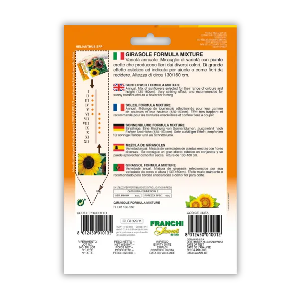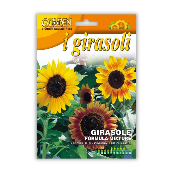 Večbarvna okrasna sončnica (Girasole Ornamentale Multicolor) je enoletna rastlina z velikimi cvetovi v različnih barvnih odtenkih. Rastlina najbolje uspeva na sončnih legah in je primerna za rezano cvetje. Cveti od poletja do jeseni in jo lahko sadimo skupaj z amarantom, cinijami, ognjičem in okrasnimi travami za visoko, barvito in opazno poletno zasaditev. 4g.