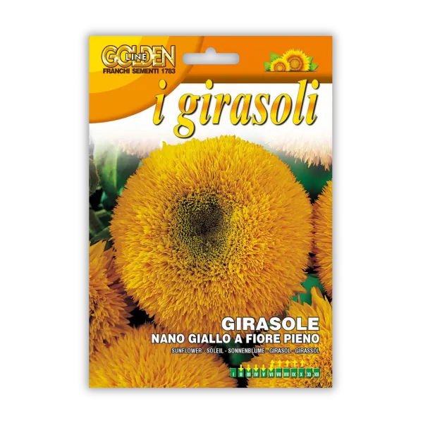 Nizka sončnica z rumenim polnim cvetom (Girasole Nano Giallo a Fiore Pieno) je enoletna rastlina z obilo listja in številnimi kompaktnimi cvetovi. Primerna je za zasaditev v cvetlične grede ali vzgojo v lončkih. Doseže višino do 60 cm. Pakiranje: 4g.