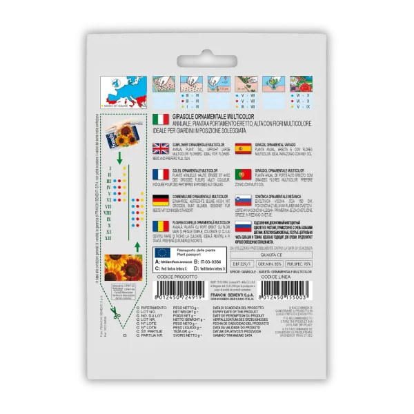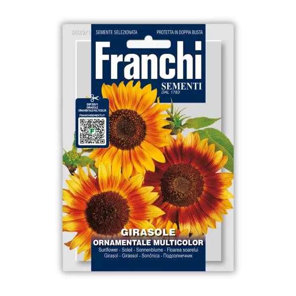 Večbarvna okrasna sončnica (Girasole Ornamentale Multicolor) je enoletna rastlina z velikimi cvetovi v različnih barvnih odtenkih. Rastlina najbolje uspeva na sončnih legah in je primerna za rezano cvetje. Cveti od poletja do jeseni in jo lahko sadimo skupaj z amarantom, cinijami, ognjičem in okrasnimi travami za visoko, barvito in opazno poletno zasaditev. 4g.