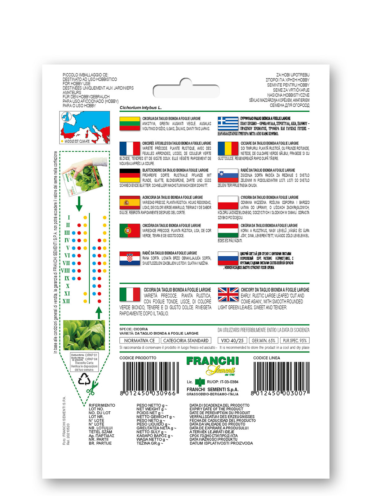 Radič Catalogna Gigante di Chioggia je srednje zgodnja sorta z dolgimi, teo zelenimi listi in širokimi, svetlimi stebli, idealnimi za pripravo solat. Pakiranje: 10g.