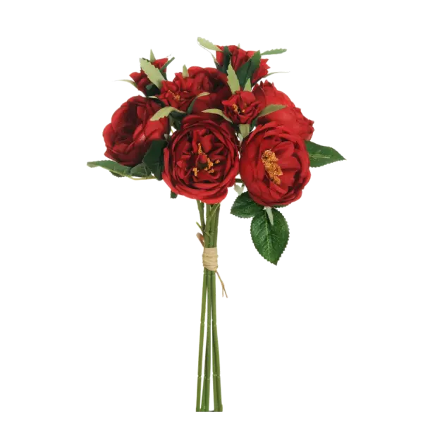 Umetni šopek vrtnic Austin v rdeči barvi z bujnimi cvetovi in zelenjem. Odlična izbira za elegantno notranjo dekoracijo brez potrebe po vzdrževanju.