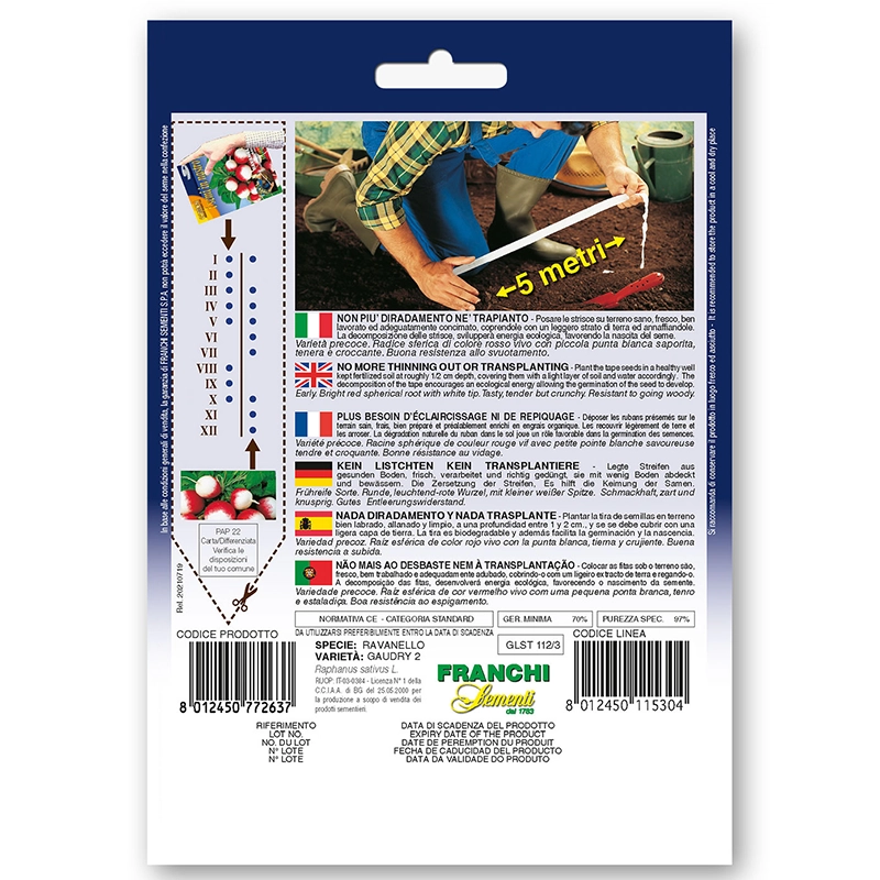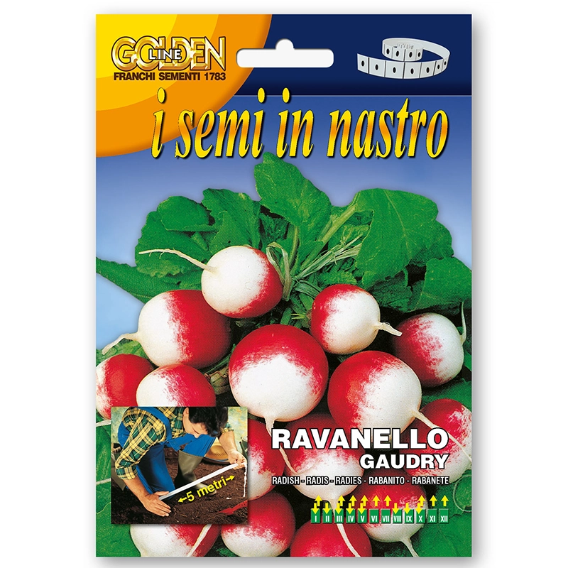 Redkvice GAUDRY – semena na traku za enostavno in natančno setev. Zgodnja sorta redkvice s čvrstim, okroglim korenom intenzivne rdeče barve in drobno belo konico. Meso je mehko, hrustljavo in prijetno pikantno. Odlikuje jo dobra odpornost proti olesenitvi, zato ostane dlje časa nežna in okusna. Odlična za hitro spomladansko ali jesensko pridelavo – primerna za setev od februarja do oktobra.