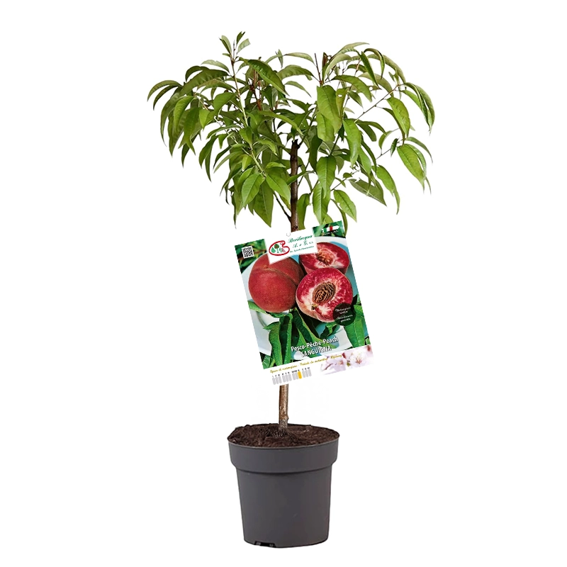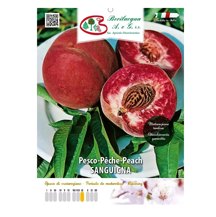 Breskev Sanguigna ima srednje velike in barvite plodove z značilnim rdeče-vijoličnim mesom, ki je okusno in zelo aromatično. Sadike so kakovostne dvoletne sadike italijanskega porekla, visoke 140–160 cm, v loncih z obsegom 20–22 cm.