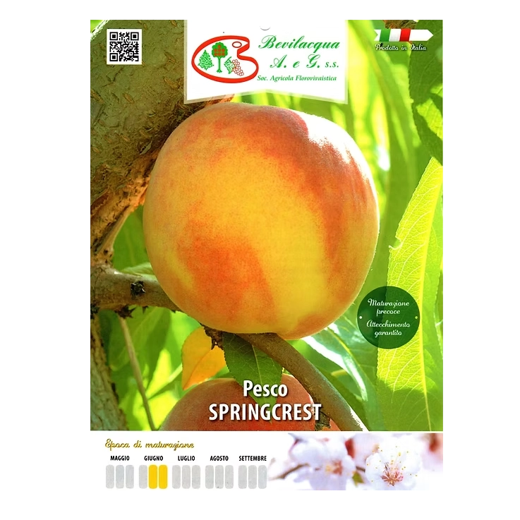 Breskev Sprincrest ima velike rdeče plodove na rumeni podlagi, z rumenim mesom, ki ima dobro konsistenco in odličen okus. Sadike so kakovostne dvoletne sadike italijanskega porekla, primerne za hitro rast in zgodnejši pridelek. Sadike so visoke 140–160 cm, v loncih z obsegom 20–22 cm.
