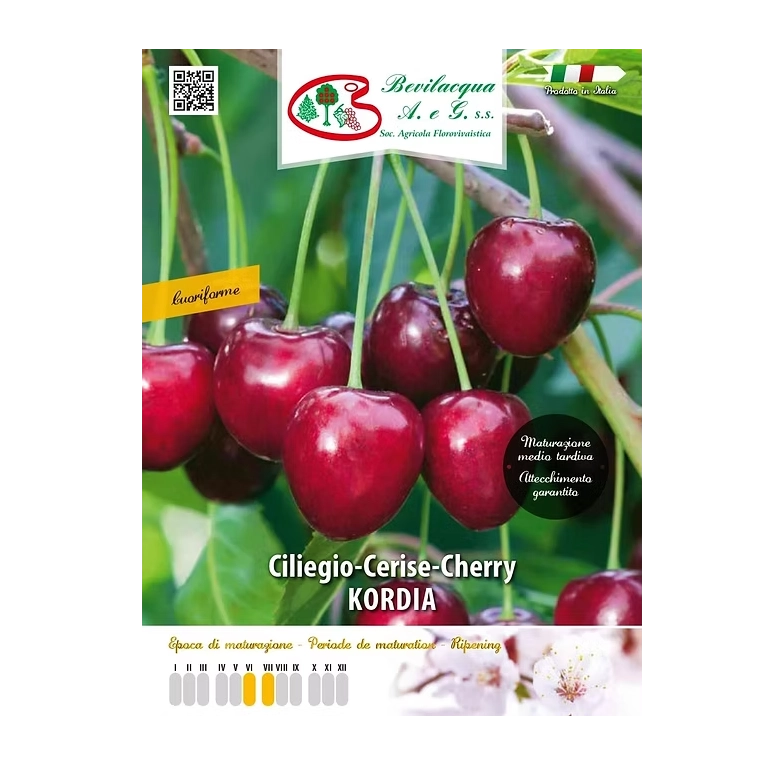 ‘Kordia’ je ena najbolj cenjenih durona sort češenj, ki slovi po svojih velikih, srčastih plodovih intenzivno rdeče do temno rdeče barve. Ponujamo kakovostne dvoletne sadike italijanskega porekla, ki zagotavljajo hitrejši razvoj in zgodnejši pridelek. Sadike so visoke 140–160 cm, v loncih z obsegom 20–22 cm.