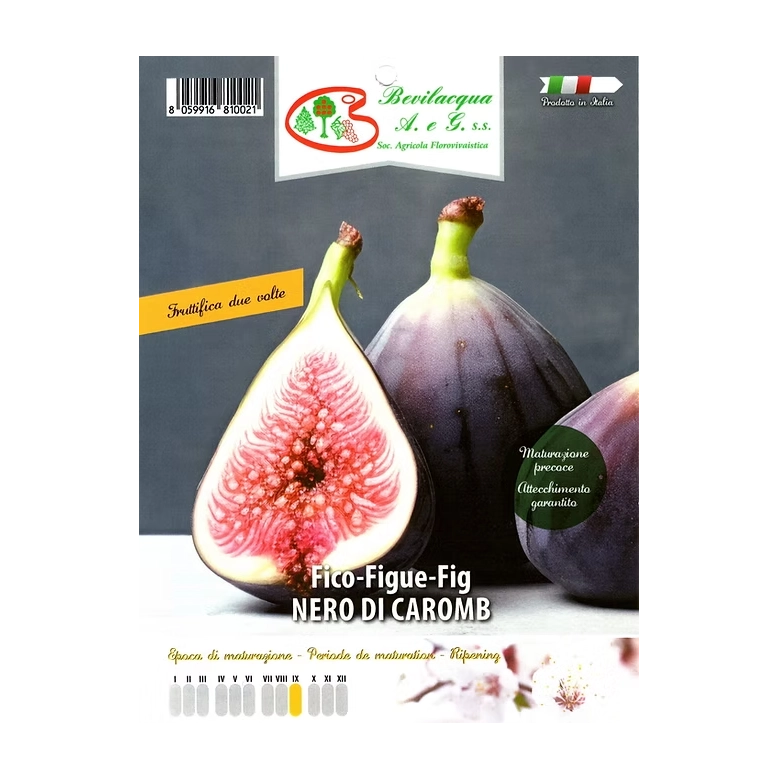 Figa NERO DI CAROMB z velikimi temnimi podolgovatimi plodovi. Ponujamo kakovostne dvoletne sadike italijanskega porekla, ki zagotavljajo hitrejši razvoj in zgodnejši pridelek. Sadike so visoke od 140 - 160 cm, v loncih z obsegom 20 - 22 cm.