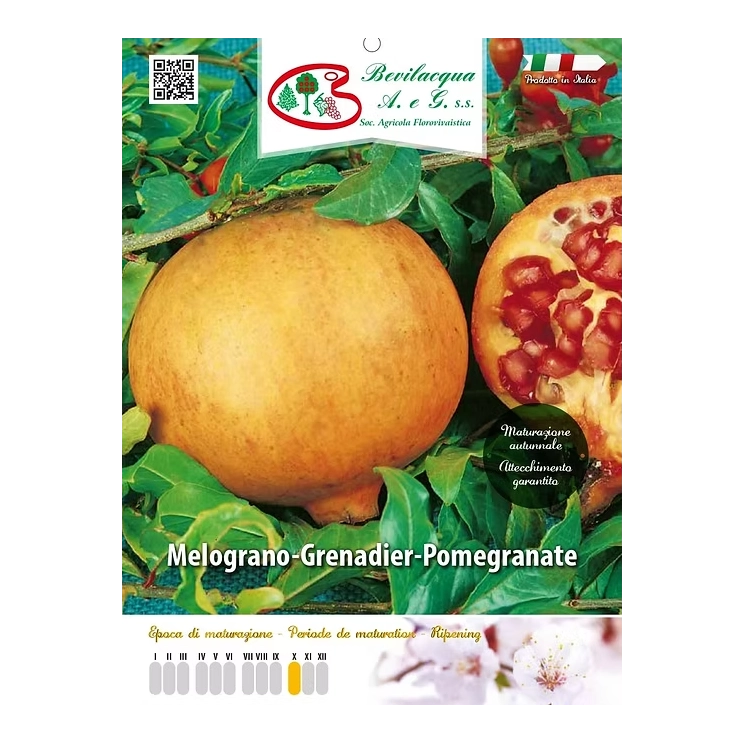 Granatno jabolko je rustikalna, odporna rastlina, ki se enostavno goji na različnih tleh in daje obilo pridelka. Ponujamo kakovostne dvoletne sadike italijanskega porekla, ki zagotavljajo hitrejši razvoj in zgodnejši pridelek. Sadike so visoke od 140 - 160 cm, v loncih z obsegom 20 - 22 cm.