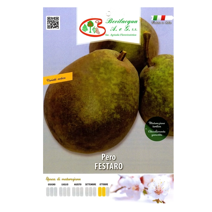Festaro je stara zimska sorta hruške z majhnimi plodovi in tankim vratom. Plodovi imajo bel olup, meso pa je čvrsto, sladkega okusa, granulasto in aromatično. Sorta je zelo rustikalna, odporna na bolezni in primerna za dolgotrajno shranjevanje. Primerno je za svežo porabo, pečenje v pečici in kasnejšo uporabo čez zimo. Sadike so kakovostne dvoletne sadike italijanskega porekla, visoke 140–160 cm, v loncih z obsegom 20–22 cm.