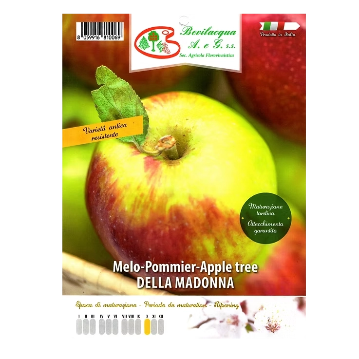 DELLA MADONNA je stara, rustikalna in odporna sorta jablane, ki ne potrebuje posebnih tretiranj. Ponujamo kakovostne dvoletne sadike italijanskega porekla, ki zagotavljajo hitrejši razvoj in zgodnejši pridelek. Sadike so visoke 140–160 cm, v loncih z obsegom 20–22 cm.