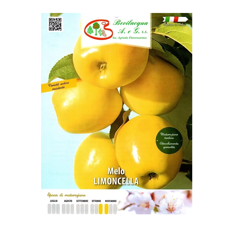 Limoncino je stara rustikalna sorta jablane, ki je zelo odporna in ne potrebuje posebnih tretiranj. Ponujamo kakovostne dvoletne sadike italijanskega porekla, ki zagotavljajo hitrejši razvoj in zgodnejši pridelek. Sadike so visoke 140–160 cm, v loncih z obsegom 20–22 cm.