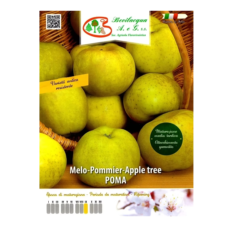 Poma je stara venecijanska sorta jablane, ki je rustikalna in odporna, ne potrebuje posebnih tretiranj. Ponujamo kakovostne dvoletne sadike italijanskega porekla, ki zagotavljajo hitrejši razvoj in zgodnejši pridelek. Sadike so visoke 140–160 cm, v loncih z obsegom 20–22 cm.
