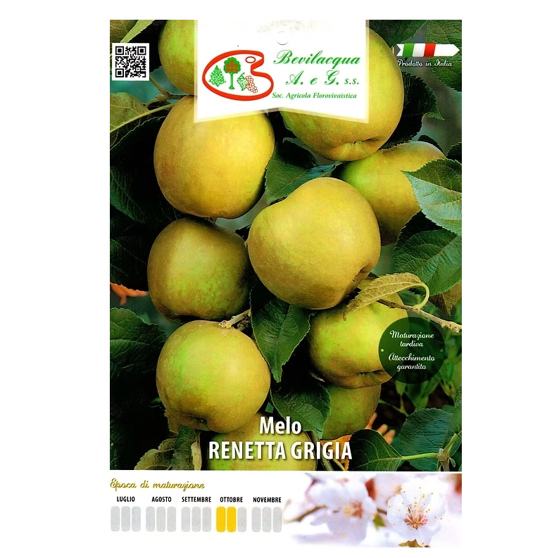 Renetta Grigia je stara sorta jablane z velikimi ploskatimi plodovi in hrapavo rjavo-sivo lupino. Meso je hrustljavo, aromatično, rahlo kislo in sladkasto, z odličnim okusom Ponujamo kakovostne dvoletne sadike italijanskega porekla, ki zagotavljajo hitrejši razvoj in zgodnejši pridelek. Sadike so visoke 140–160 cm, v loncih z obsegom 20–22 cm.