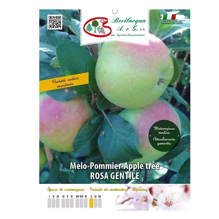 ‘Rosa Gentile’ je stara, rustikalna sorta jabolka, ki navdušuje z srednje velikimi, rahlo sploščenimi plodovi. Ponujamo kakovostne dvoletne sadike italijanskega porekla, ki zagotavljajo hitrejši razvoj in zgodnejši pridelek. Sadike so visoke 140–160 cm, v loncih z obsegom 20–22 cm.