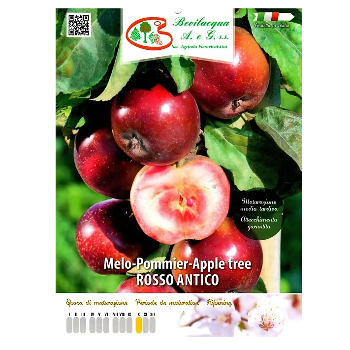 Rosso Antico je stara sorta jablane z srednje velikimi rdečimi plodovi in rdečim mesom, ki je aromatično, hrustljavo in rahlo kislo. Ponujamo kakovostne dvoletne sadike italijanskega porekla, ki zagotavljajo hitrejši razvoj in zgodnejši pridelek. Sadike so visoke 140–160 cm, v loncih z obsegom 20–22 cm.