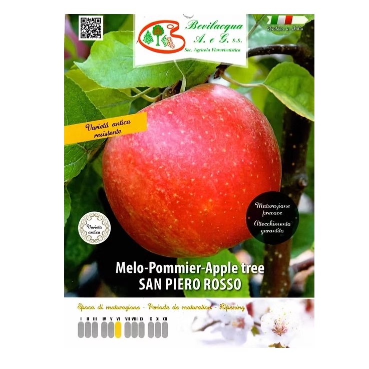 Rosso San Piero je stara, rustikalna in odporna sorta jablane, ki ne potrebuje posebnih tretiranj. Ponujamo kakovostne dvoletne sadike italijanskega porekla, ki zagotavljajo hitrejši razvoj in zgodnejši pridelek. Sadike so visoke 140–160 cm, v loncih z obsegom 20–22 cm.