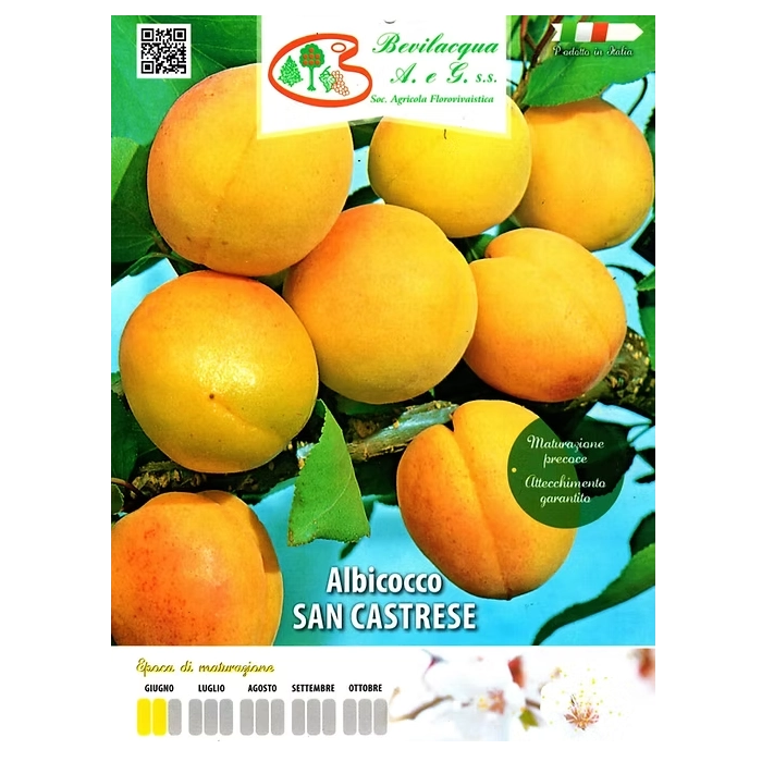 San Castrese je srednje zgodnja sorta marelice, cenjena po svoji rodnosti in odpornosti. Plodovi so srednje veliki do veliki, intenzivno oranžne barve, z odličnim okusom in aromo. Zaradi svoje kakovosti so primerni za svežo porabo, pripravo sokov, sadnih solat, marmelad in shranjevanje. Sadike so dvoletne, visoke 140–160 cm, vzgojene v loncih premera 20–22 cm, kar omogoča sajenje skozi vse leto.
