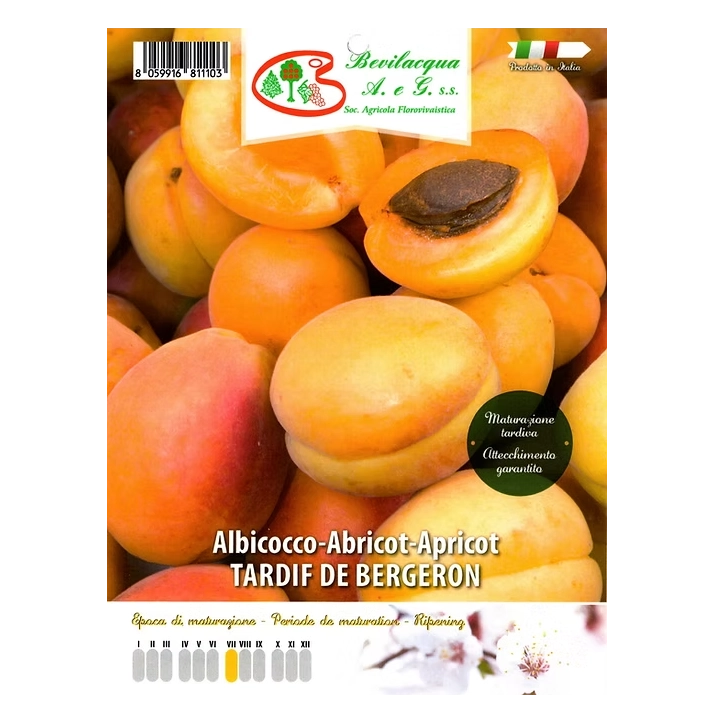 Tardiva di Bergeron je poznopoletna sorta marelice, znana po velikih, rahlo sploščenih plodovih oranžne barve, pogosto z rdečim odtenkom na sončni strani. Sorta je cenjena zaradi poznega cvetenja, kar zmanjša tveganje za pozebe, in zaradi redne rodnosti. Plodovi imajo čvrsto, aromatično meso prijetno sladko-kislega okusa. Sadike so dvoletne, visoke 140–160 cm, vzgojene v loncih premera 20–22 cm, zato jih lahko sadimo skozi vse leto.