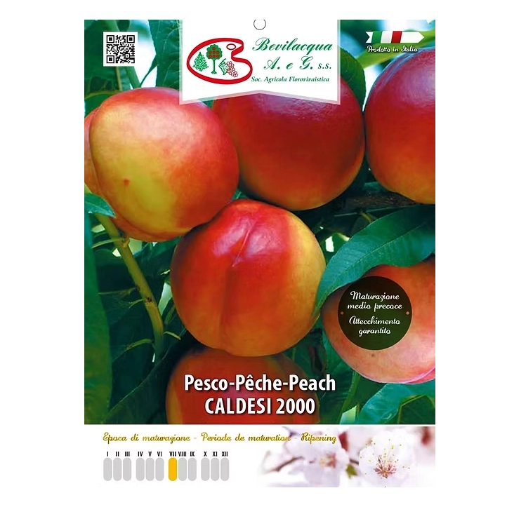 Nektarina Caldesi 2000 ima velike rdeče plodove, z dišečim sladkim belim mesom in odlično konsistenco, ki ostane sveže dolgo po obiranju. Sadike so kakovostne dvoletne sadike italijanskega porekla, ki zagotavljajo hitrejši razvoj in zgodnejši pridelek. Sadike so visoke 140–160 cm, v loncih z obsegom 20–22 cm.
