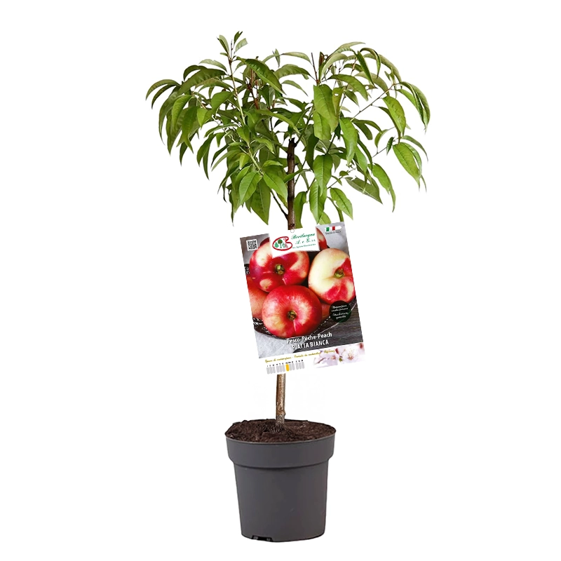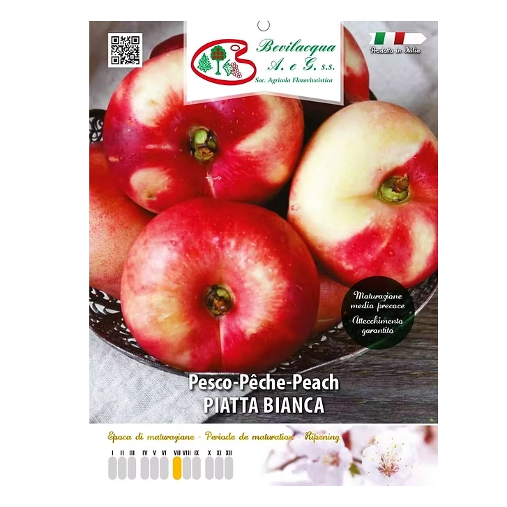 Nektarina Piatta Bianca Noce ima srednje velike, barvite plodove s značilno plosko obliko, z dišečim belim mesom in odličnim okusom, ki je enostavno za uživanje. Sadike so kakovostne dvoletne sadike italijanskega porekla, ki zagotavljajo hitrejši razvoj in zgodnejši pridelek. Sadike so visoke 140–160 cm, v loncih z obsegom 20–22 cm.