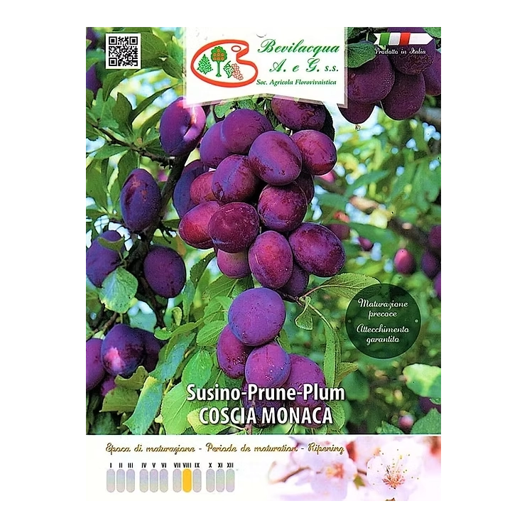 Sliva COSCIA MONACA je rustikalna sorta, odporna na mraz in enostavna za vzgojo. Ponujamo kakovostne dvoletne sadike slive italijanskega porekla, ki zagotavljajo hitrejši razvoj in zgodnejši pridelek. Sadike so visoke od 140 - 160 cm, v loncih z obsegom 20 - 22 cm.