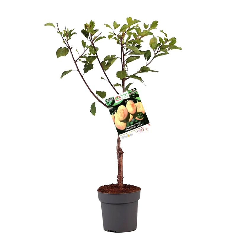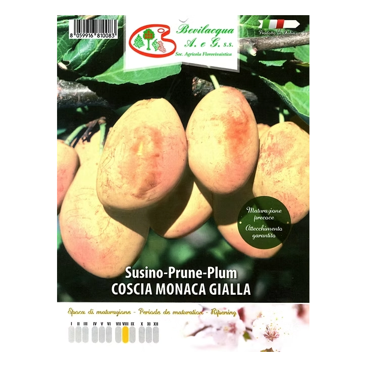 Sliva COSCIA MONACA GIALLA z majhnimi rumenimi plodovi. Ponujamo kakovostne dvoletne sadike slive italijanskega porekla, ki zagotavljajo hitrejši razvoj in zgodnejši pridelek. Sadike so visoke od 140 - 160 cm, v loncih z obsegom 20 - 22 cm.