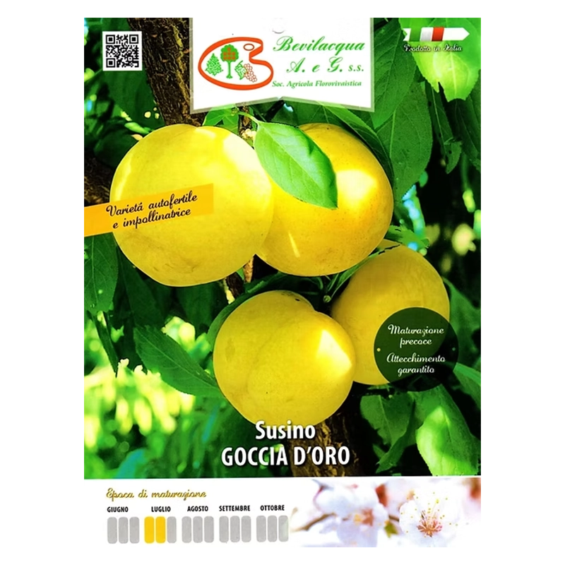Sliva GOCCIA D'ORO z rumenimi srednje velikimi plodovi, zgodnje zorenje. Ponujamo kakovostne dvoletne sadike slive italijanskega porekla, ki zagotavljajo hitrejši razvoj in zgodnejši pridelek. Sadike so visoke od 140 - 160 cm, v loncih z obsegom 20 - 22 cm.