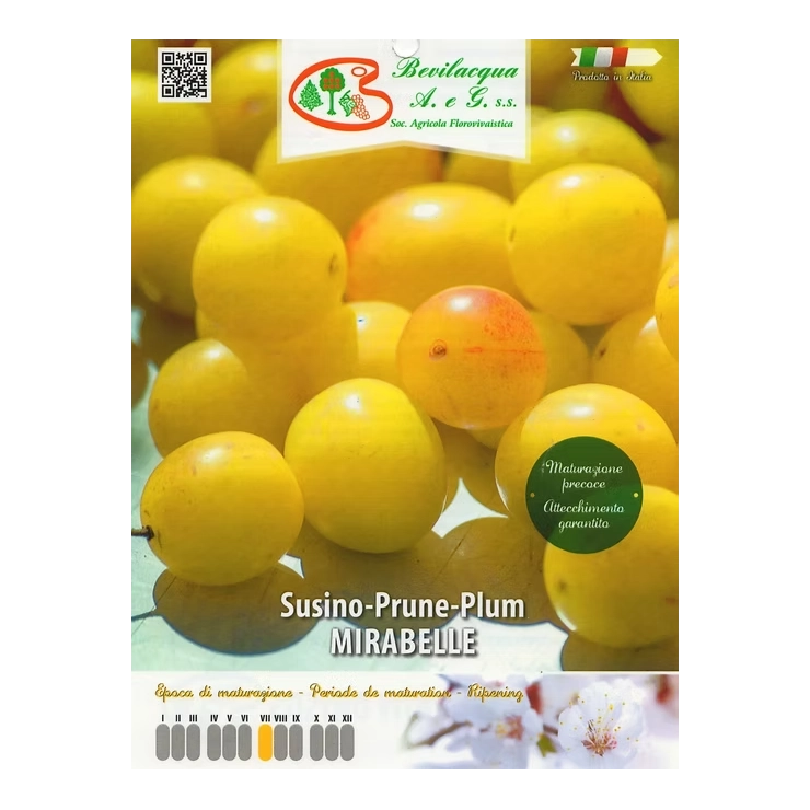Sliva MIRABELLE z majhnimi rumenimi plodovi. Ponujamo kakovostne dvoletne sadike slive italijanskega porekla, ki zagotavljajo hitrejši razvoj in zgodnejši pridelek. Sadike so visoke od 140 - 160 cm, v loncih z obsegom 20 - 22 cm.