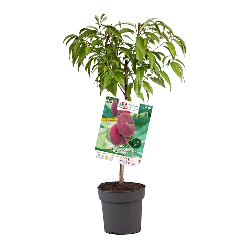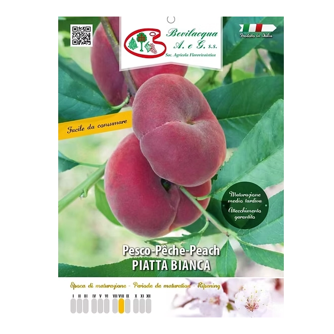 Piatta Bianca je vinogradniška sorta breskve z srednje velikimi in barvitimi plodovi, ki imajo značilno ploščato obliko. Meso je belo, zelo aromatično in okusno, enostavno za uživanje. Sadike so kakovostne dvoletne sadike italijanskega porekla, visoke 140–160 cm, v loncih z obsegom 20–22 cm.