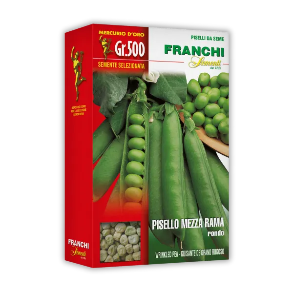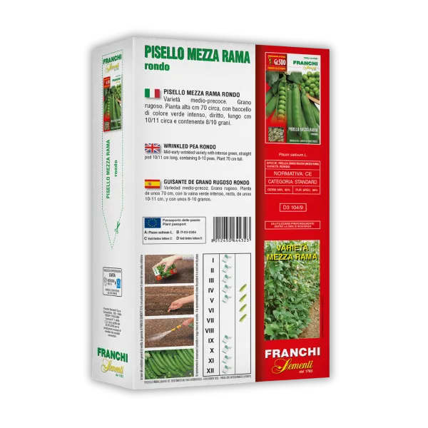 Semena graha Pisello Mezza Rama Rondo, srednje zgodnja sorta, ki doseže višino 70 cm. Rastlina ima dolge zelene stroke s 8-10 nagubanimi zrni, primerna za zamrzovanje.