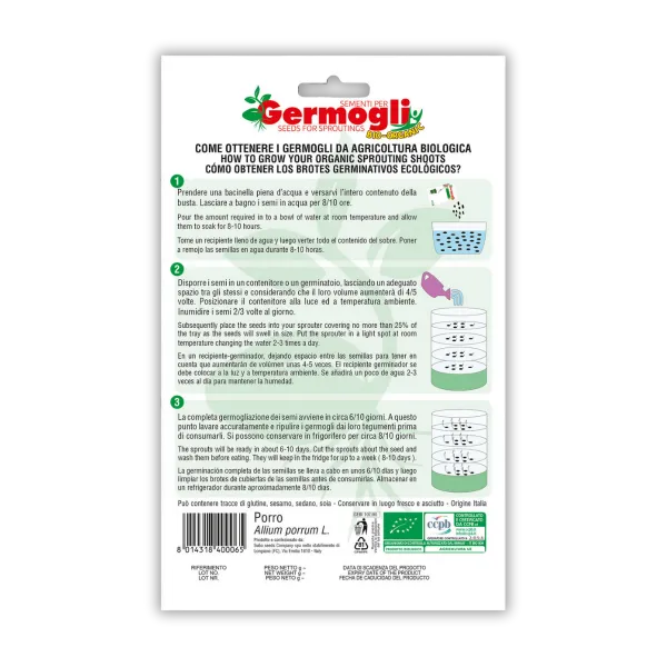 Semena kalčkov pora, 15 g, za hitro vzgojo hranljivih in svežih porovih kalčkov. Bogati s klorofilom in lahko prebavljivi.
