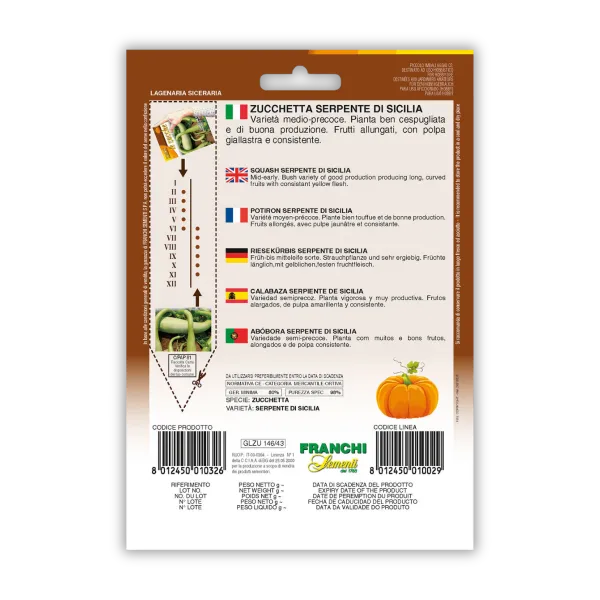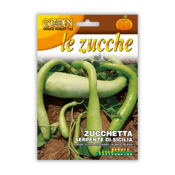 Sicilijanska kačja buča (Lagenaria siceraria) je srednje zgodnja sorta, znana po svojih dolgih, ukrivljenih plodovih, ki spominjajo na kače. Ti plodovi imajo rumenkasto meso, ki je čvrsto in okusno, kar to sorto naredi idealno za različne jedi, zlasti v sicilijanski kuhinji. Rastlina je nizka in zelo rodna, plodove pa se lahko pobira od poletja do zgodnje jeseni. Setev je možna od februarja do julija, uspeva pa na sončnih legah in v rodovitni zemlji.