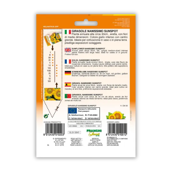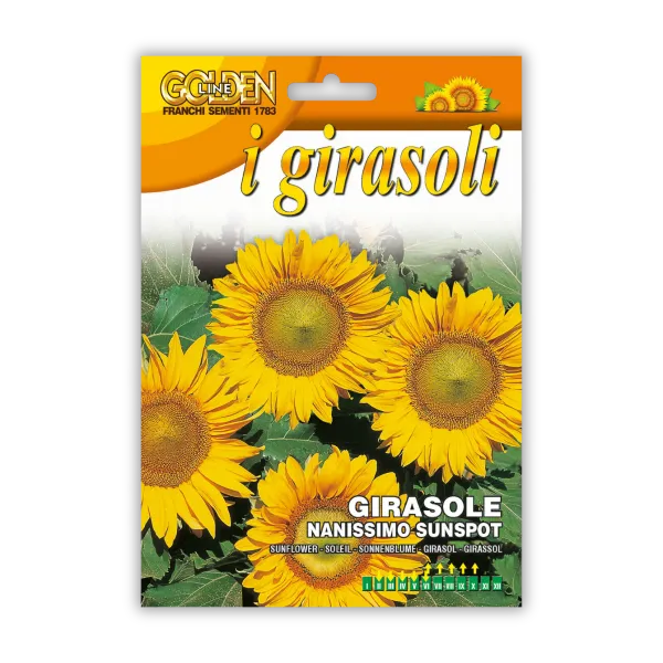 Sončnica Nizka Sunspot (Girasole Nanissimo Sunspot) je enoletnica, ki zraste približno 30 cm visoko. Ima srednje velike, intenzivno rumene cvetove in je idealna za rezano cvetje ter za gojenje na balkonih ali terasah. Sadimo jo lahko skupaj z majhnimi cvetlicami, kot so petunije, lobelije in nezaboravke, ki prav tako potrebujejo veliko sonca. Pakiranje: 4g.