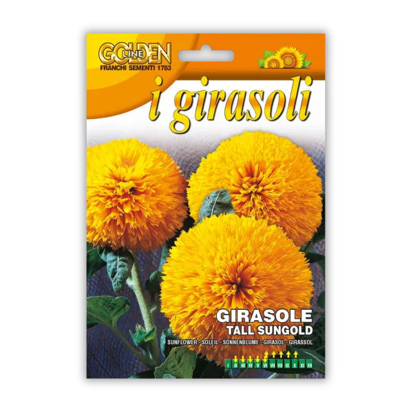 Nizka sončnica z rumenim polnim cvetom (Girasole Nano Giallo a Fiore Pieno) je enoletna rastlina z obilo listja in številnimi kompaktnimi cvetovi. Primerna je za zasaditev v cvetlične grede ali vzgojo v lončkih. Doseže višino do 60 cm. Pakiranje: 4g.