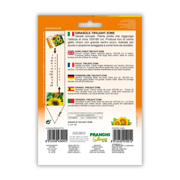 Sončnica Twilight Zone (Helianthus annuus) je enoletna sorta, ki doseže višino med 150 in 180 cm. Rastlina proizvaja velike svetlo rumene cvetove z izrazitim teim sredinskim delom, kar ustvarja osupljiv kontrast. Sončnica je idealna za sajenje v cvetličnih gredicah na sončnih legah in je primerna tudi za rezano cvetje. Setev je možna od februarja do junija, rastlina pa bo prinesla čudovite barve v vaš vrt. Sadimo jo lahko z visokimi cvetlicami, kot so zlati deček (rudbekija), mešane astre, sivka in ognjič, ki dopolnjujejo njeno višino in barve, ter z nižjimi rožami, kot so ne pozabnice in nageljni, ki uspevajo v delni senci pod sončnico.