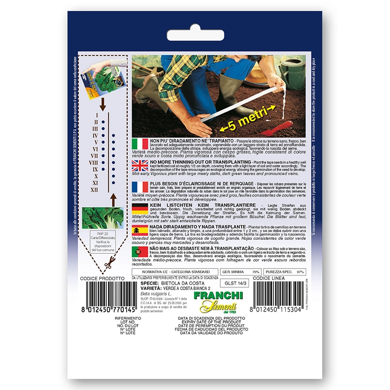 Blitva VERDE DA TAGLIO - semena na traku za enostavno setev. Srednje zgodnja sorta. Zgodnja in bujna sorta z odlično pridelavo. Rastlina ima gladke, nežne liste intenzivno zelene barve, ki so odlični za svežo uporabo. Po rezi ponovno hitro zraste, zato je idealna za večkratno obiranje.